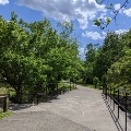 The northward branch heads northeast through the Hethwood neighborhood, crosses Prices Fork Road, and then continues north to Glade Road. North of Glade Road, the trail enters Heritage Community Park, the former Brown farm. Paths through the