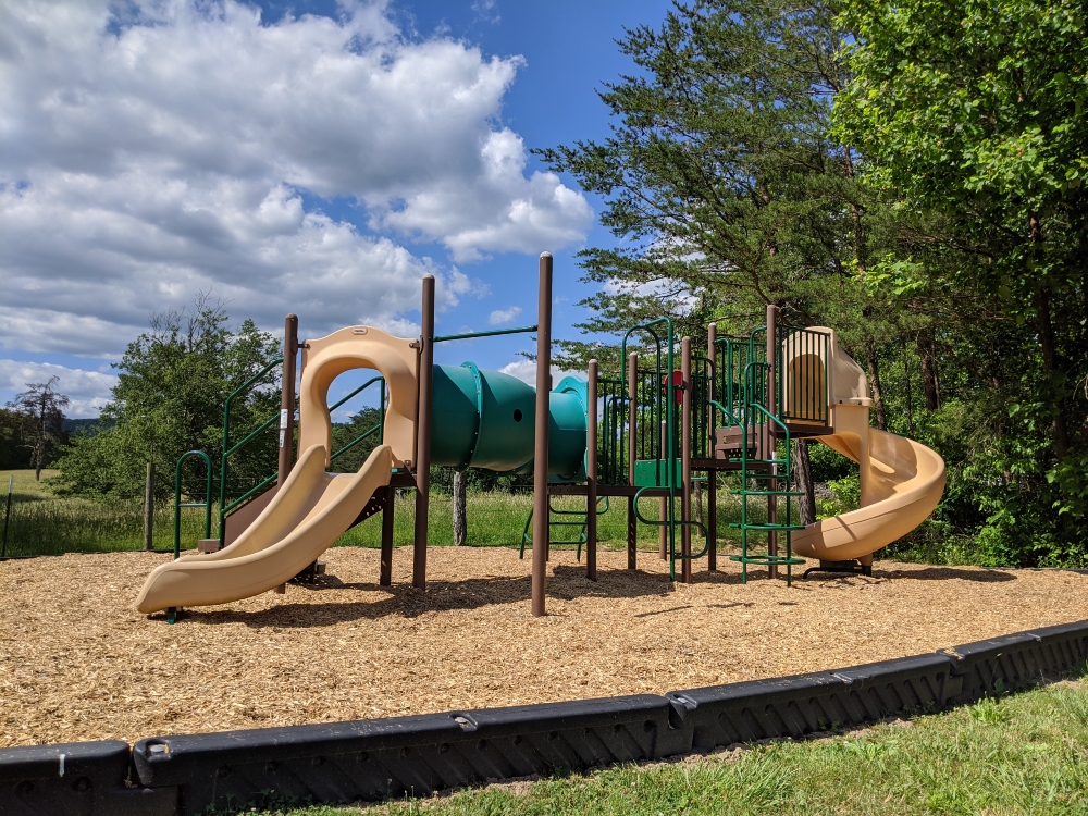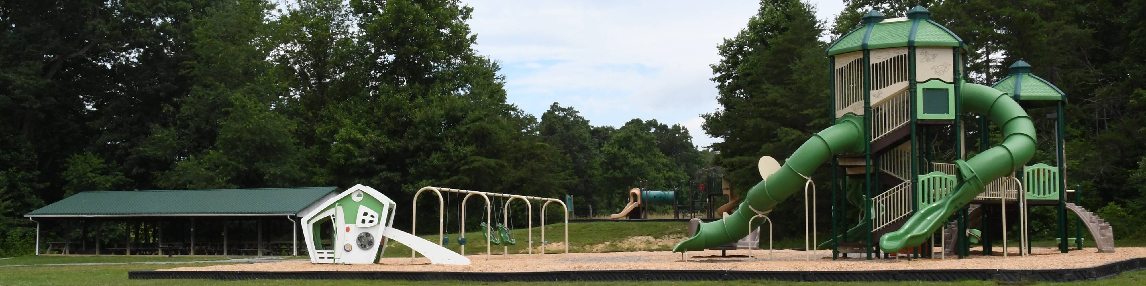 The small playground features two slides, climbing areas, and a tunnel. It is located next to the picnic shelter.