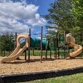 The large playground features two large tube slides, multiple climbing areas, swings, and more.