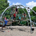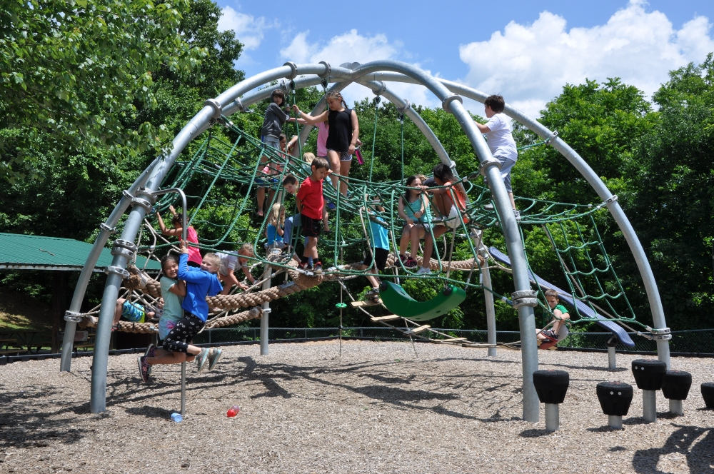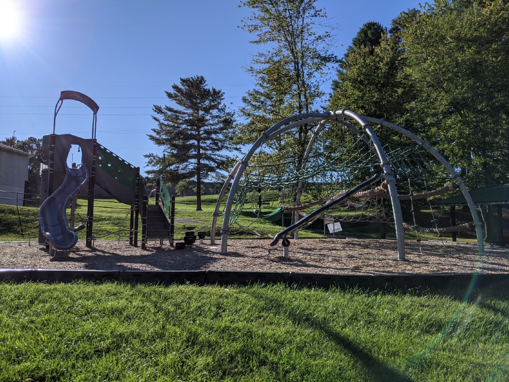 The playground at Mid County Park features a large cargo rope net climbing structure, slide, climbing wall features, swinging hammock, and balancing merry-go-round. The playground is conveniently located next to the picnic shelters and outdoor basketball court. An ADA accessible path leads to the playground.