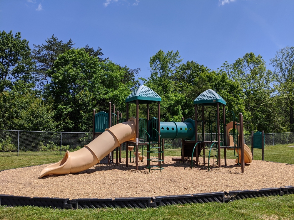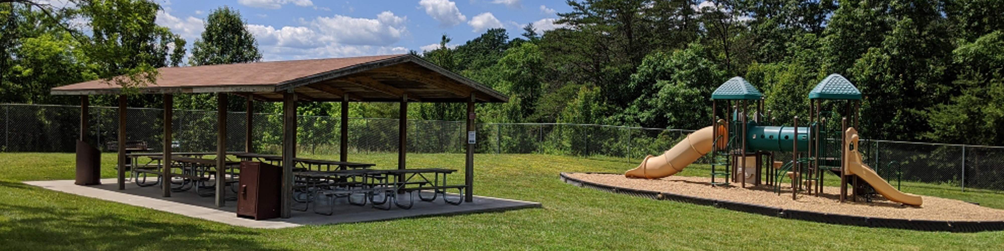 The playground features two slides, multiple climbing features, and a tunnel. It is located next to the picnic shelter.