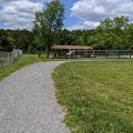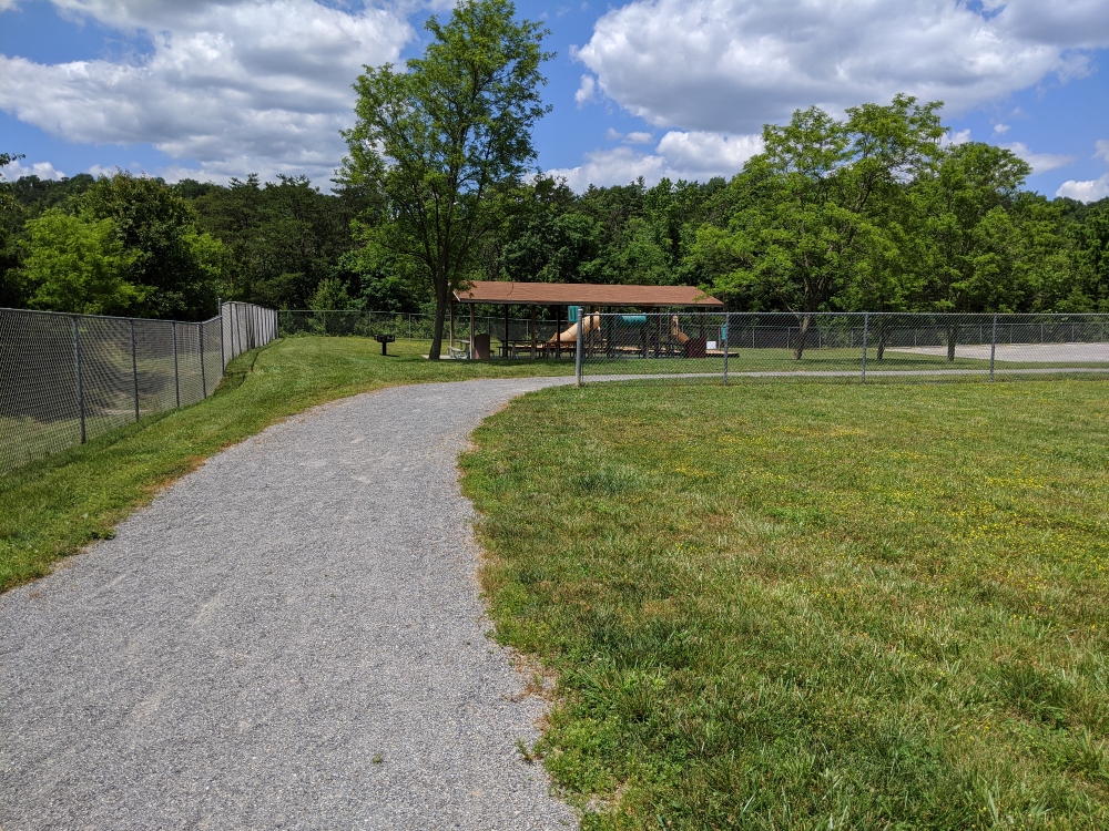 A walking path encircles the ball field and open green space. The flat terrain is perfect for children's games, playing with the dog, and picnicking.
